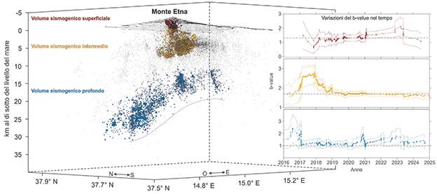 Fig. - Distribuzione spaziale degli ipocentri dei terremoti localizzati nell’area etnea tra il 2005 e il 2024, con tre volumi sismogenici di interesse evidenziati: superficiale (rosso), intermedio (giallo) e profondo (blu). A destra sono riportate le variazioni nel tempo del parametro b-value, che fornisce indicazioni sui movimenti del magma all’interno della crosta terrestre.