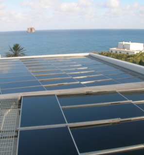 Amici strombolani gli hanno realizzato una costruzione leonardesca: un’ avveniristica architettura di pannelli solari piatti scorrevoli, per consentire la manutenzione dei solai di copertura del tetto -necessaria per la sismicità dell’isola- a basso impatto ambientale e molto funzionali.
