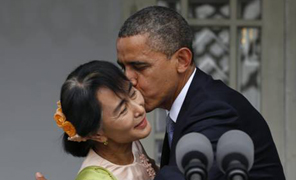 Il presidente Usa Barack Obama, in visita storica in Birmania per sostenere le riforme politiche del Paese, è stato accolto dalla leader dell'opposizione birmana Aung San Suu Kyi nella sua abitazione a Rangoon. I due premi Nobel per la pace (San Suu Kyi nel 1991 e Obama nel 2009) avevano avuto un breve incontro lo scorso settembre alla Casa Bianca. Questo secondo incontro è invece nell'abitazione di famiglia di Suu Kyi dove la leader dell'opposizione birmana ha trascorso 15 anni agli arresti domiciliari.