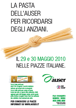 Sabato 29 e domenica 30 maggio 2010, torna nelle principali piazze italiane, l’ottava edizione de “la pasta dell’Auser” l’appuntamento con la solidarietà a sostegno del Filo d’Argento Auser, il servizio di telefonia sociale che aiuta gli anziani soli. I volontari dell’associazione Auser saranno in centinaia di piazze italiane con gli spaghetti biologici frutto del Progetto Libera Terra che, grazie alla legge 109 del '96, restituisce alla collettività beni confiscati alle mafie con l'obiettivo di sviluppare un circuito economico legale e virtuoso. La pasta dell’Auser è buona due volte perché unisce il sapore della solidarietà a quello dell’impegno per la legalità e la giustizia. Una pasta “antimafia” che aiuta gli anziani.