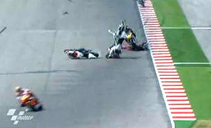 Il nipponico della Suter ha perso il controllo della sua moto che è stata centrata in pieno da Alex De Angelis, mentre Redding sembra che non abbia potuto evitare Tomizawa già finito a terra. Tomizawa è stato trasferito d'urgenza in elicottero all'Ospedale di Cesena, le sue condizioni sono state giudicate "gravi". "E' stata la caduta più brutta della mia carriera - ha detto De Angelis - quello è un punto dove siamo in pieno, quando Tomizawa è caduto ho fatto di tutto per prendere la sua moto e non lui, io sono illeso, è incredibile". La gara è stata poi vinta dallo spagnolo Toni Elias (Moriwaki) davanti al connazionale Julian Simon (Suter) e allo svizzero Thomas Luthi (Moriwaki).