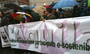 Tra le prime delegazioni arrivate davanti a Piazza d'Armi sono quelle di Terzigno (Napoli) e Boscoreale (Napoli): ad accogliere i manifestanti c'é una lavatrice gigante fatta in cartone con dei panni appesi e uno striscione con la scritta "Basta speculare sui nostri panni". Dall'altro lato c'é invece uno stand per raccogliere le firme per la legge di iniziativa popolare elaborata dai cittadini sulla ricostruzione, affinché si abbiano finalmente regole e fondi certi, diversamente da quanto accade oggi. Il resto lo fanno le immancabili carriole e gli striscioni con le scritte 'Macerie di democrazia'. L'arcivescovo dell'Aquila, Giuseppe Molinari, ha rivolto un appello "a tutti gli aquilani migliori di fare in modo che questa manifestazione di domani sia veramente un grido al Governo, allo Stato, per dire che L'Aquila c'é e ha i suoi problemi, ma esorto tutti ad eliminare possibili infiltrazioni e strumentalizzazioni".