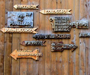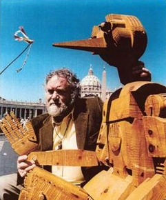 Qui le sue insegne stradali sono diventate famosissime, scolpite lettera per lettera, come un nome inciso in un’indelebile materia viva che germoglia per le vie asfaltate e di marmo travertino. Romantico e fantasioso, ma tosto e di carattere, dal cuore buono ma forte, sguardo intenso e intelligente, con sfumature di malinconica tenerezza, l’artista è vivace come il suo Pinocchio tecnologico, forma ironica e giocosa come l’autore. Un artista ricco di passioni, buongustaio. Ama dolci, il buon vino, l’ottimo cibo, materia prima per chi ha costruito la sua vita immersa nel piacere, quel tipo di gusto che si tocca, che si plasma con le mani, che si sogna e poi si vive a occhi aperti, lucidi e consapevoli di essere reali. Le sue sono sculture amiche, divertenti, che fanno compagnia, che arredano una casa come farebbe un gruppo di amici gioiosi, loquaci e spiritosi. Un misto tra magia e quotidianità, tra selvaggio e metropolitano.